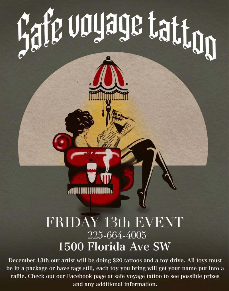 And if you’ve ever been here on a Friday the 13th, you know we don’t just give back—we have fun while doing it. Our infamous Friday the 13th Tattoo Events have become a staple in Denham Springs, packed with flash tattoos, live music, local vendors, and a donation-based raffle loaded with prizes like gift certificates, original artwork, and exclusive SVT merch. It’s a fun celebration of tradition, creativity, and showing up for one another.