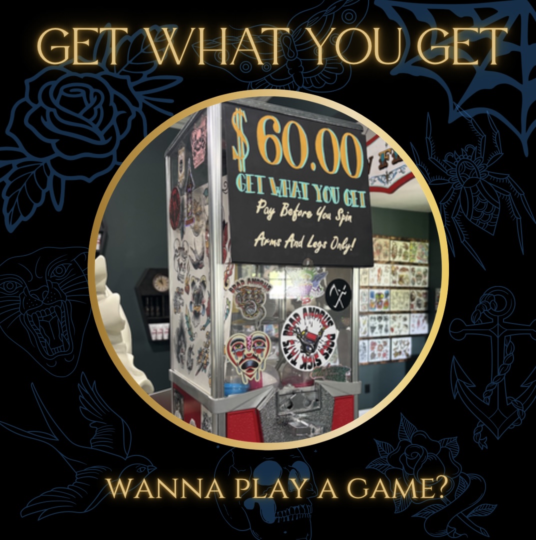 Here’s how it works: for $60, you get a token to spin our custom gumball machine. Whatever design you land on—that’s your tattoo. Bold, clean, and timeless, each piece is hand-drawn by our artists with classic tradition in mind. No swaps, no trade-ins—just a good story and a great tattoo.